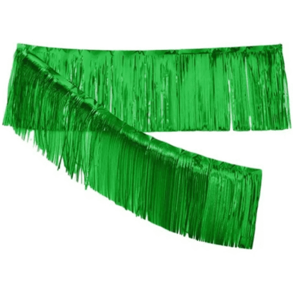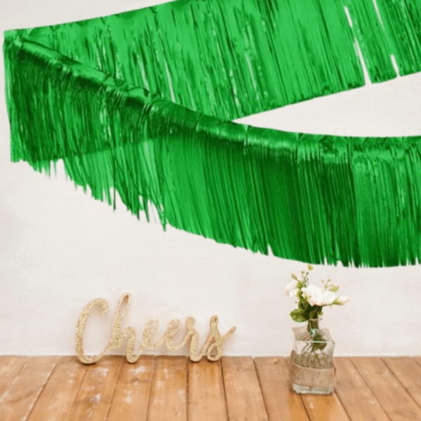 Guirnalda de flecos metálicos en color verde, ideal para decorar fiestas y eventos con un toque brillante y festivo. Su acabado reluciente crea un efecto llamativo perfecto para cumpleaños, graduaciones, aniversarios, bodas y celebraciones temáticas. Fácil de colocar en paredes, mesas, puertas o fondos de fotos, aportando elegancia y diversión a cualquier ambiente. Un accesorio versátil y práctico para realzar la decoración de tu celebración.