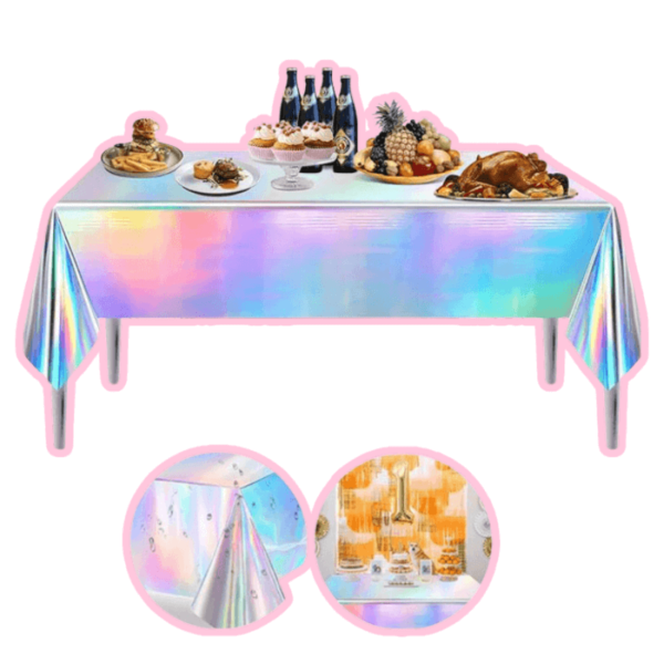 Mantel plastico Tornasol con su diseño holográfico brillante que muestra diferentes efectos de color bajo diferentes luces, todos muy hermosos, llamativos y brillantes que serán un punto destacado de tu fiesta haciéndote brillar por tu excelente decoración.