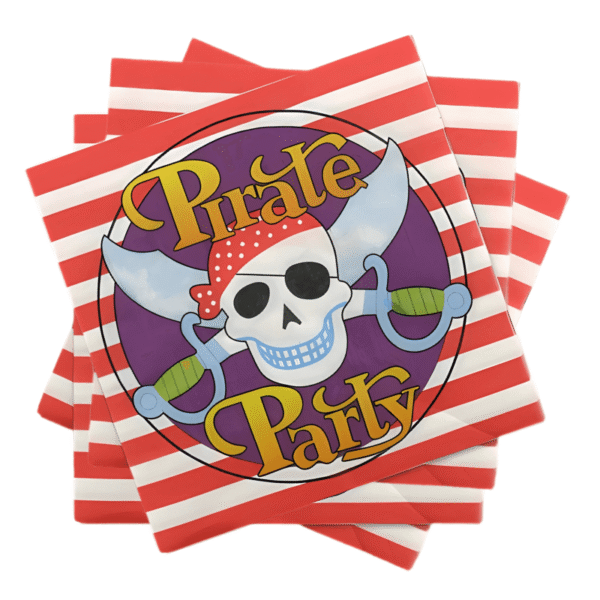 “¡Al Abordaje de la Diversión! Zarpa hacia una fiesta inolvidable con nuestras servilletas temáticas de piratas. Con un diseño audaz de calavera, parches, espadas cruzadas y las clásicas rayas rojas y blancas, estas servilletas son el tesoro perfecto para tu próxima celebración. Ideales para cumpleaños, fiestas de disfraces o cualquier evento donde la aventura y la diversión pirata sean los protagonistas. ¡Prepárate para saquear la alegría y crear recuerdos legendarios!”