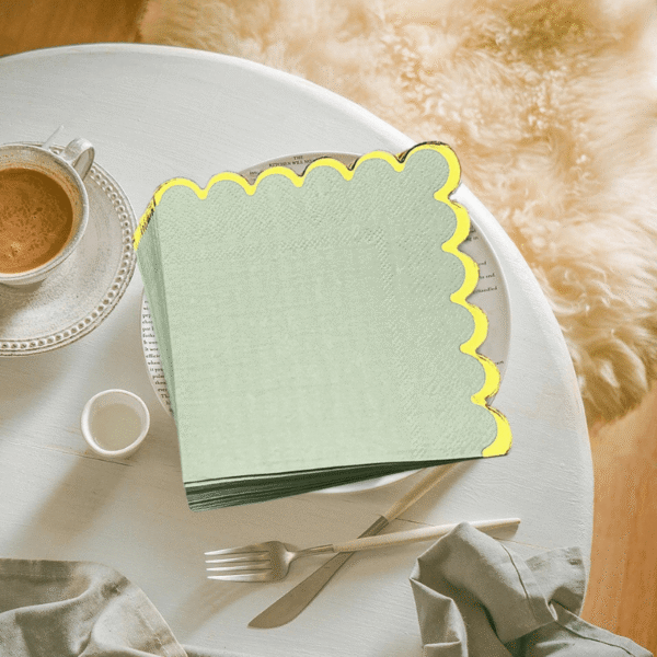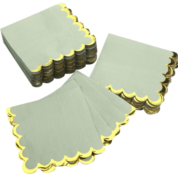 Haz que cada momento sea especial con estas exquisitas servilletas festoneadas. El suave tono verde claro se complementa a la perfección con el brillante borde dorado, creando una estética moderna y chic. Perfectas para fiestas de cóctel, cenas de gala o cualquier evento donde el estilo sea la prioridad. Estas servilletas no son solo funcionales, sino que son un accesorio decorativo que hará que tu mesa se vea increíble.
